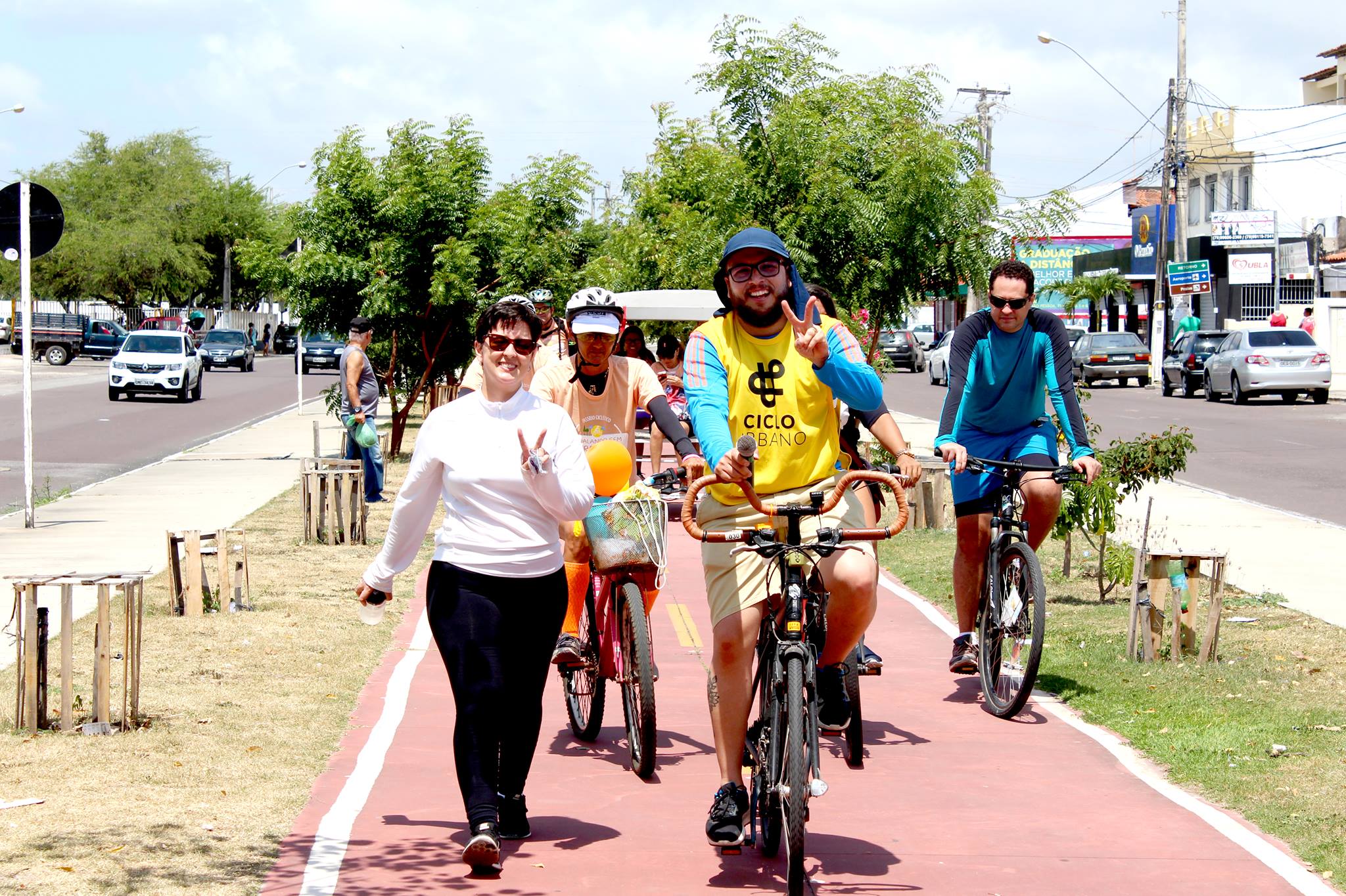 Imagem tirada de cima do minitrio dos participantes do Passeio Ciclístico Pedalando Sem Barreiras