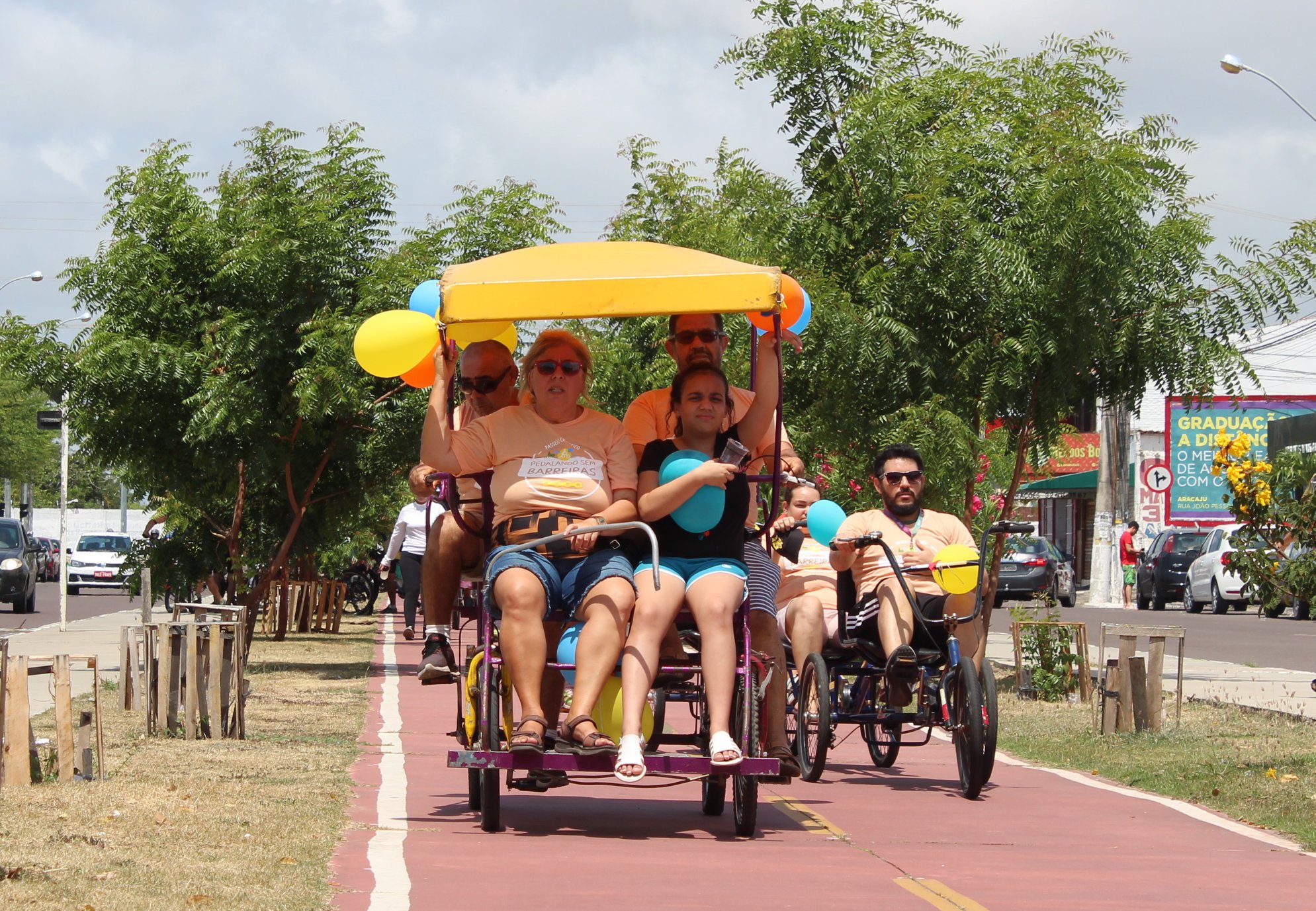 Homem pedala em ciclovia, ao lado dois homens e uma criança pedalam triciclo