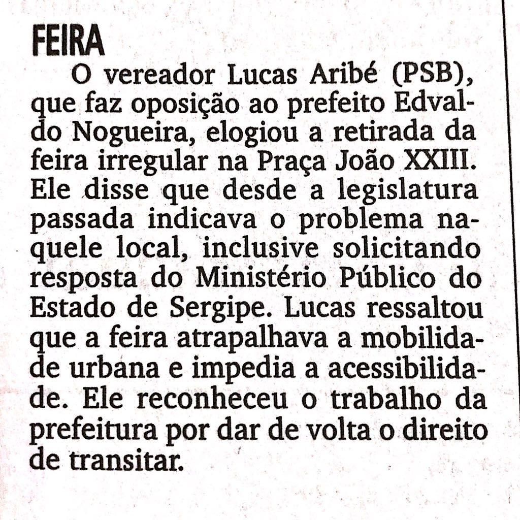 O vereador Lucas Aribé (PSB), que faz oposição ao Prefeito Edvaldo Nogueira, elogiou a retirada da feira irregular na Praça João XXIII. Ele disse que desde a legislatura passada indicava o problema naquele local, inclusive solicitando resposta do Ministério Público do Estado de Sergipe. Lucas ressaltou que a feira atrapalhava a mobilidade urbana e impedia a acessibilidade. Ele reconheceu o trabalho da prefeitura por dar de volta do direito de transitar.