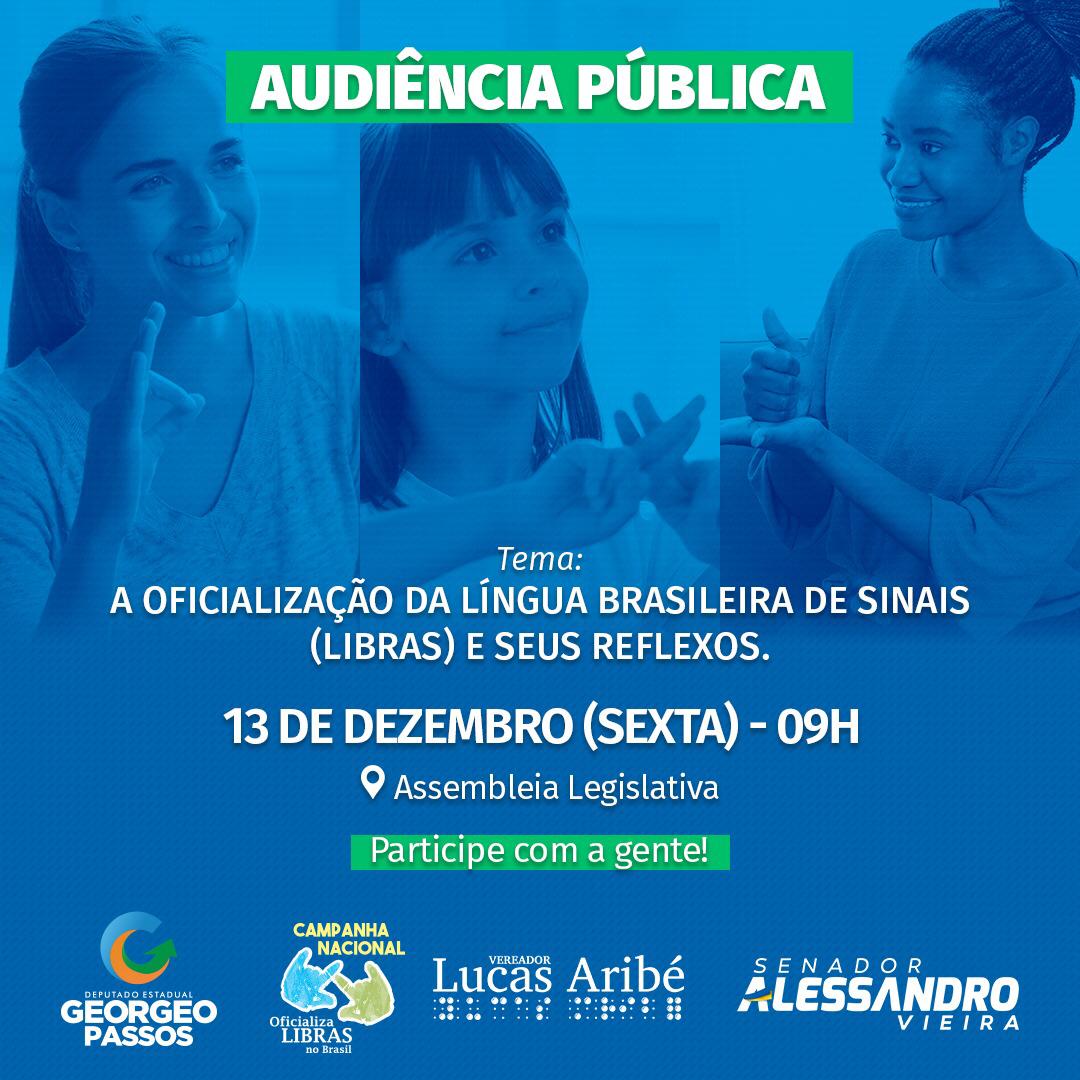 No topo está escrito AUDIÊNCIA PÚBLICA, em letras brancas sobre uma marcação verde. Ao centro, em branco, Tema: A OFICIALIZAÇÃO DA LÍNGUA BRASILEIRA DE SINAIS (LIBRAS) E SEUS REFLEXOS. 13 DE DEZEMBRO (SEXTA) - 09H. Abaixo um ícone de marcador de localização e o texto, Assembleia Legislativa. Em seguida, em letras brancas com marcação verde, Participe com a gente!